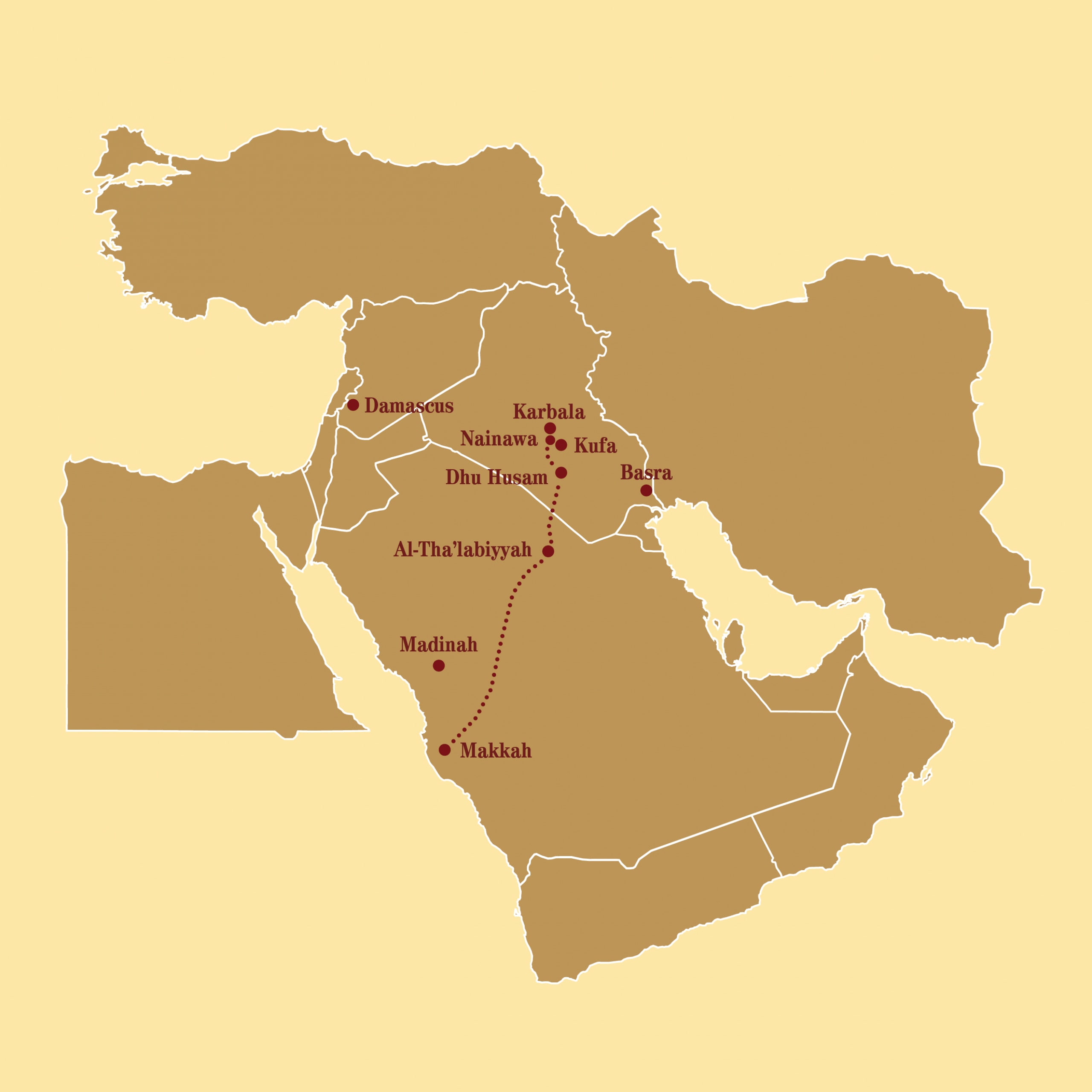 Amir Mu’awiyah (ra) passed away at the age of 70. When Yazid ascends the throne, he wrote to all the governors to take the pledge of allegiance (Bai’at) from all their subordinates. Al-Walid bin Utbah, the governor of Madinah, was tasked with obtaining the pledge of allegiance from Abdullah bin Umar (ra) , Abdullah bin Zubair (ra) and Husain bin Ali (ra) . All three refuse to pledge allegiance. Abdullah bin Zubair (ra) and Husain bin Ali (ra) leave Madinah for Makkah along with their families.