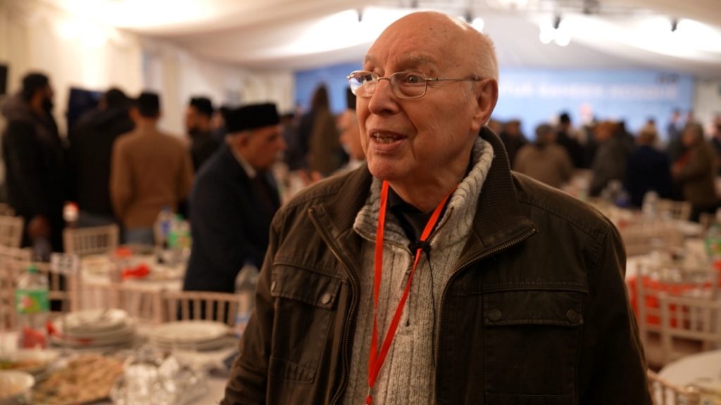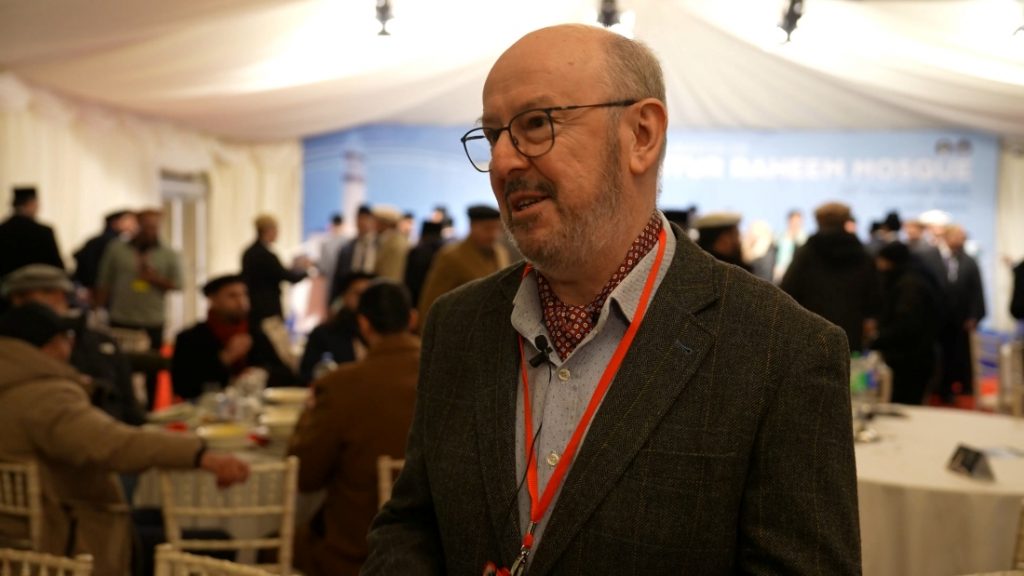 I’m Stephen Heils. I’m the design consultant that has designed this marvellous mosque. And it’s lovely to see it finally built after so many years of trying to get it through planning procedures. And then with COVID, finally built. And it’s lovely to see it lit up tonight as it has been.